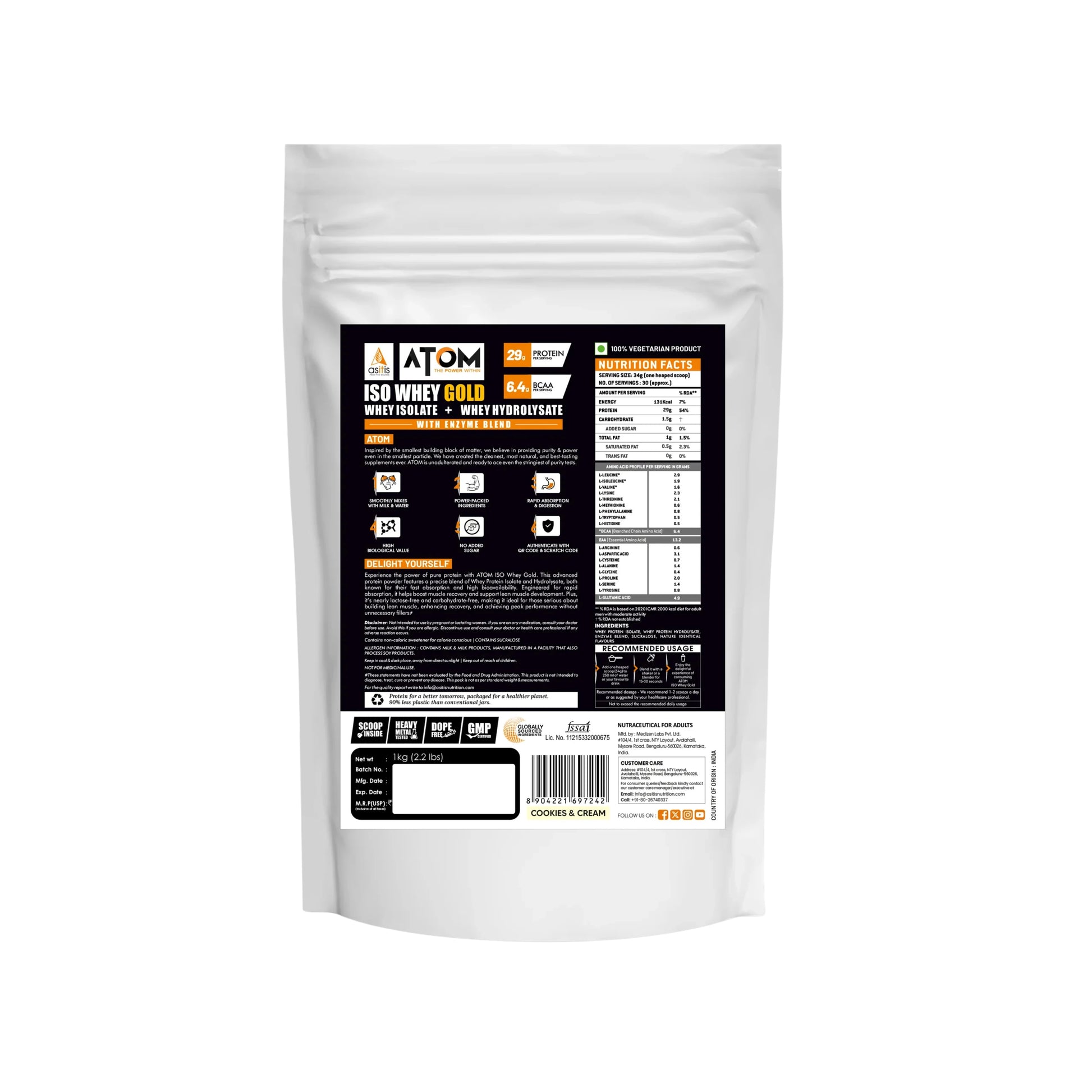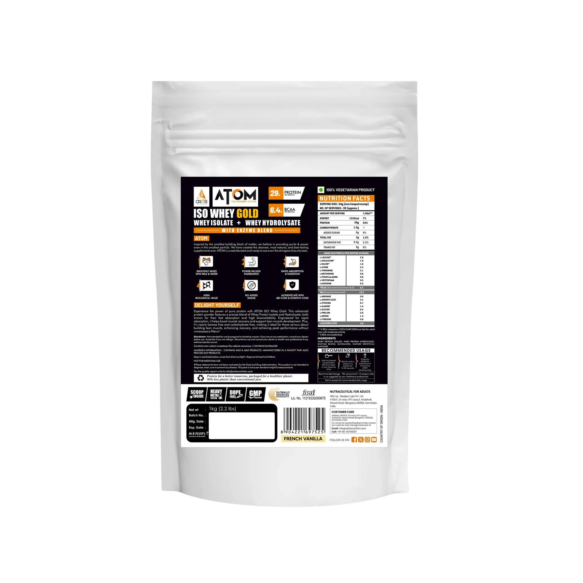 ATOM ISO Whey Gold is a premium 100% Whey Isolate protein formula designed to deliver fast-absorbing, high-quality protein to help support muscle growth, accelerate recovery, and preserve lean muscle mass. Each serving delivers: