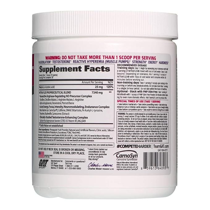 GAT Sport Nitraflex is an advanced pre-workout formula engineered for athletes who demand extreme energy, strength, focus, and pump. Powered by a potent blend of creatine nitrate, N-acetyl L-tyrosine, and caffeine, it delivers explosive performance and razor-sharp mental focus with every workout.