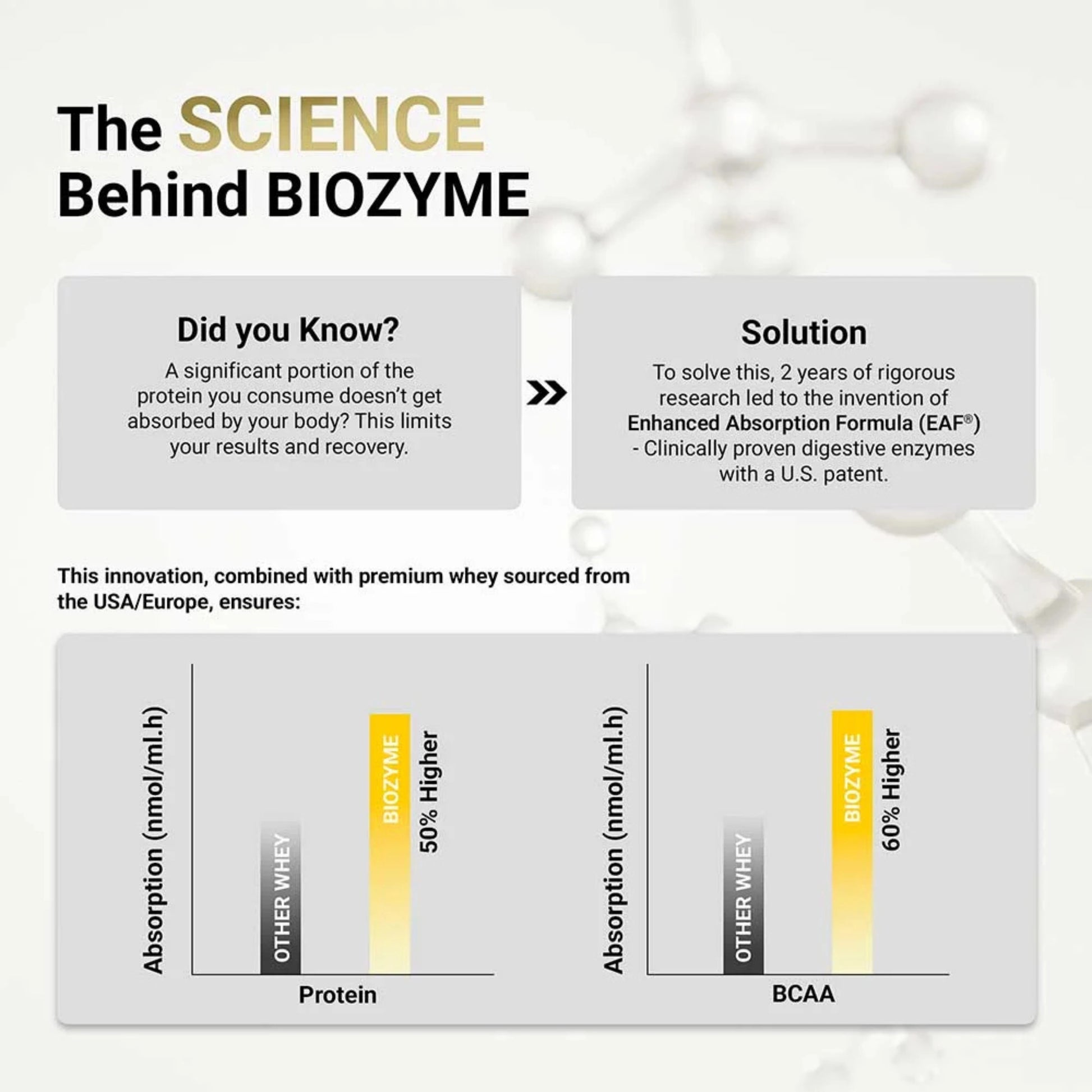 MuscleBlaze Biozyme Performance Whey Protein is specially formulated for advanced athletes and bodybuilders who demand faster results and superior absorption. Powered by the U.S. Patent-pending Enhanced Absorption Formula (EAF®), this whey protein ensures 50% higher protein absorption and better muscle recovery.