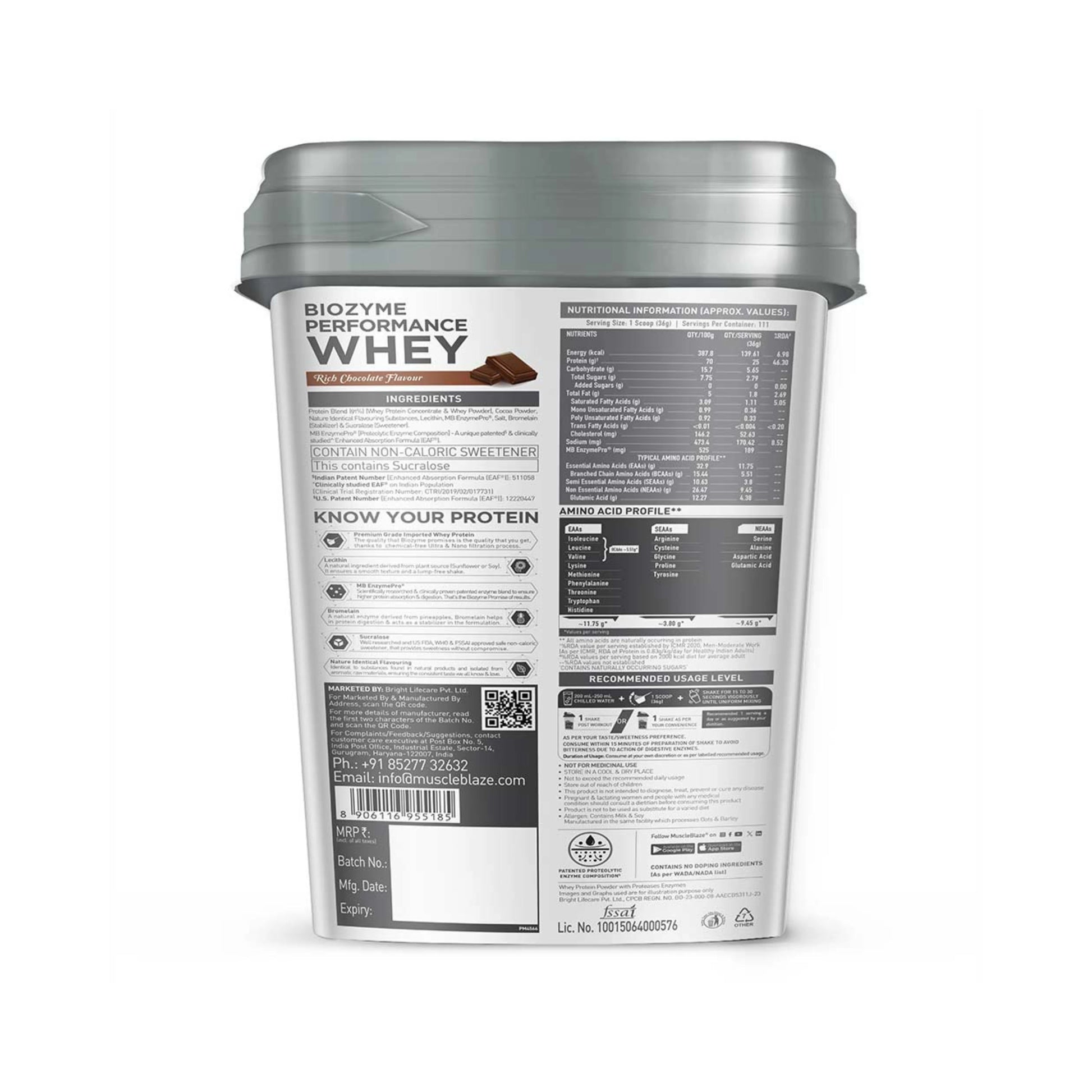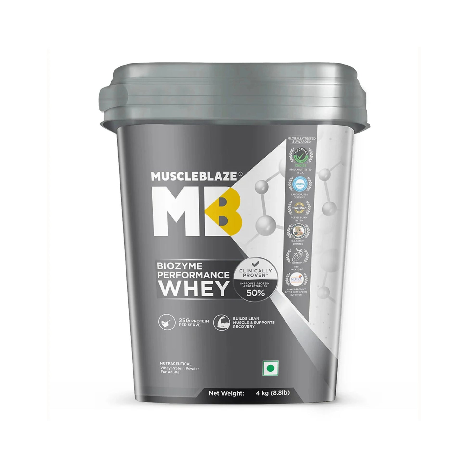 MuscleBlaze Biozyme Whey Protein is an advanced protein formula designed for better digestion, higher absorption, and faster muscle recovery. Developed using MuscleBlaze’s Enhanced Absorption Formula™ (EAF®), it offers 50% more protein absorption compared to standard whey proteins—making it ideal for Indian athletes and fitness enthusiasts.