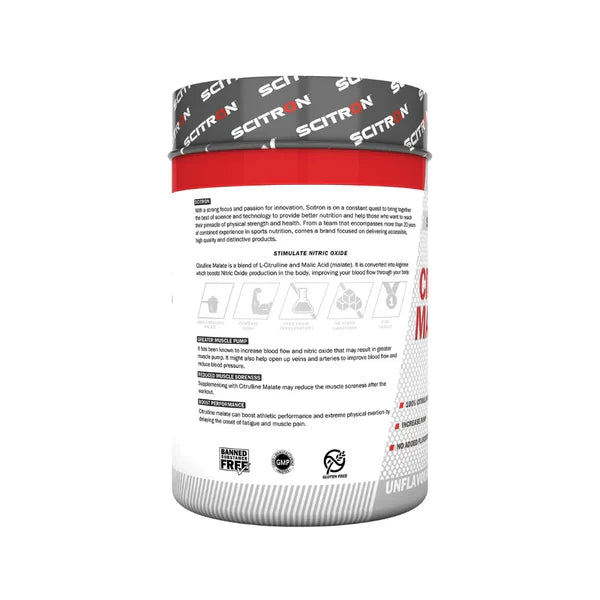 Scitron Citrulline Malate 250g is a powerful pre-workout supplement formulated to supercharge your performance, enhance blood flow, and give you intense muscle pumps. It combines Citrulline, an amino acid that plays a key role in nitric oxide production, with Malate, a compound that enhances energy production and absorption.