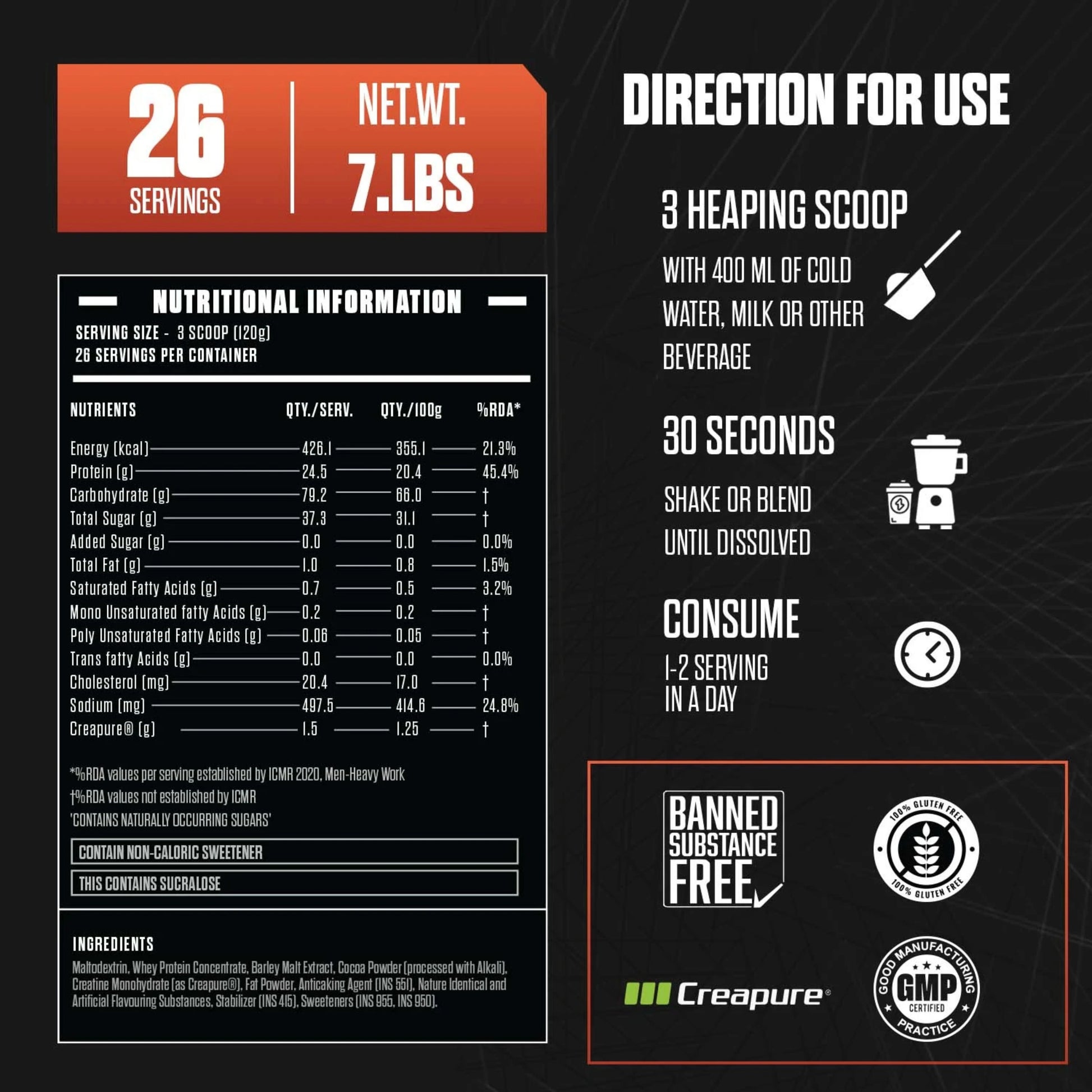 Whey Protein Concentrate, Barley Malt Extract, Cocoa Powder, Maltodextrin, Creapure® Creatine Monohydrate, Fat Powder, Anticaking Agent (INS 551), Nature Identical Flavouring Substance, Stabilizer (INS 414), Sucralose (INS 955).