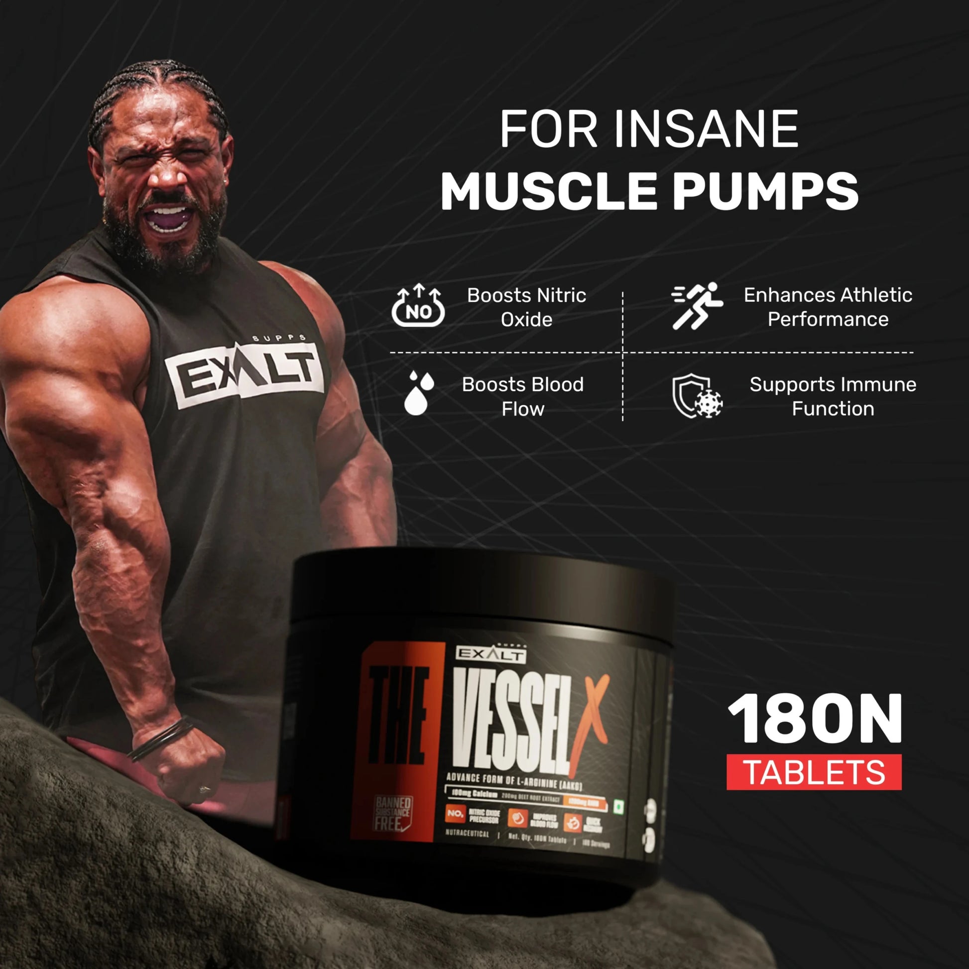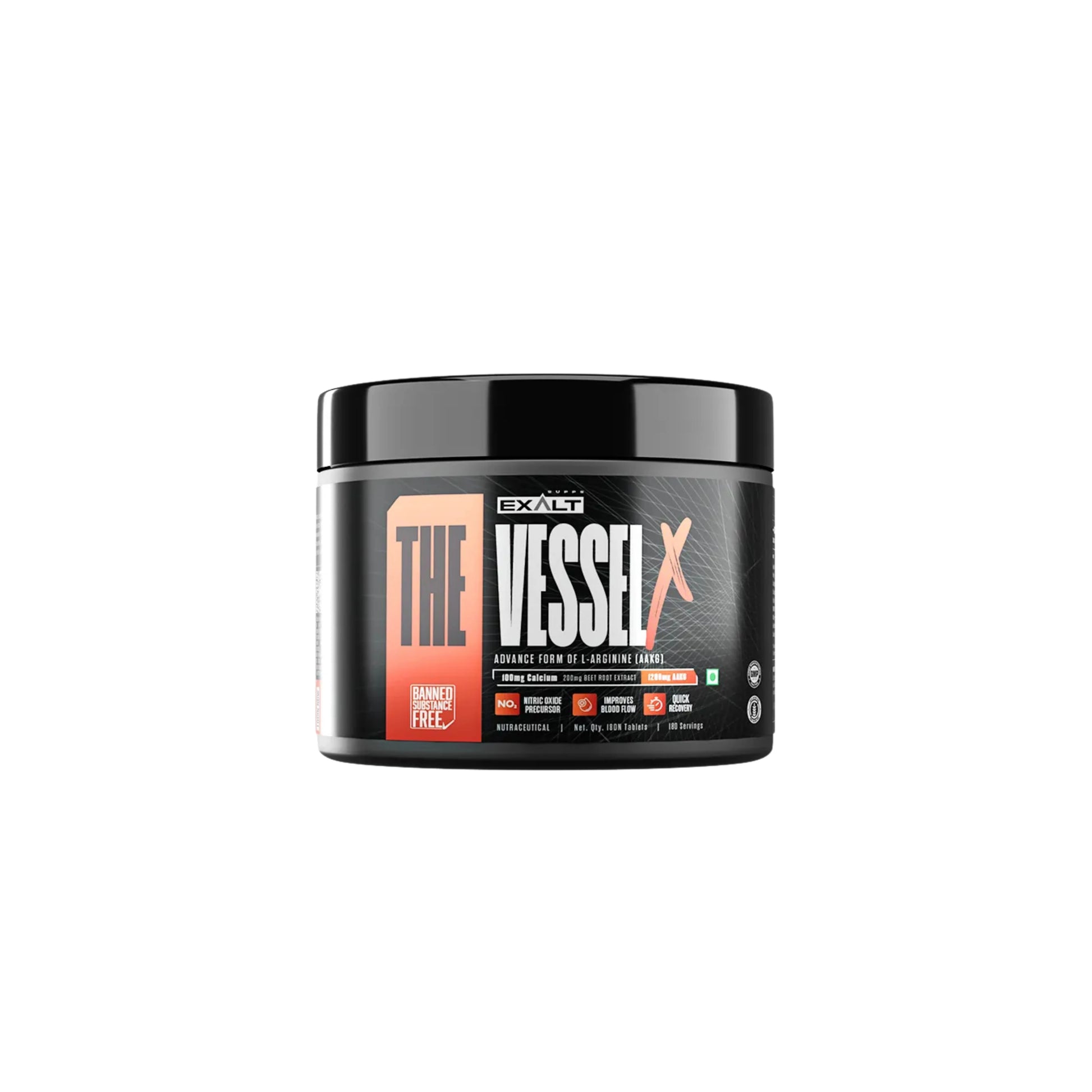 The Vessel X by Exalt Supps is a premium nitric oxide precursor supplement formulated to enhance blood flow, vascularity, and performance during workouts. This advanced formula combines AAKG (L-Arginine Alpha-Ketoglutarate) with Beetroot Extract and Calcium, aiming to support optimal vasodilation, nutrient delivery, and endurance.