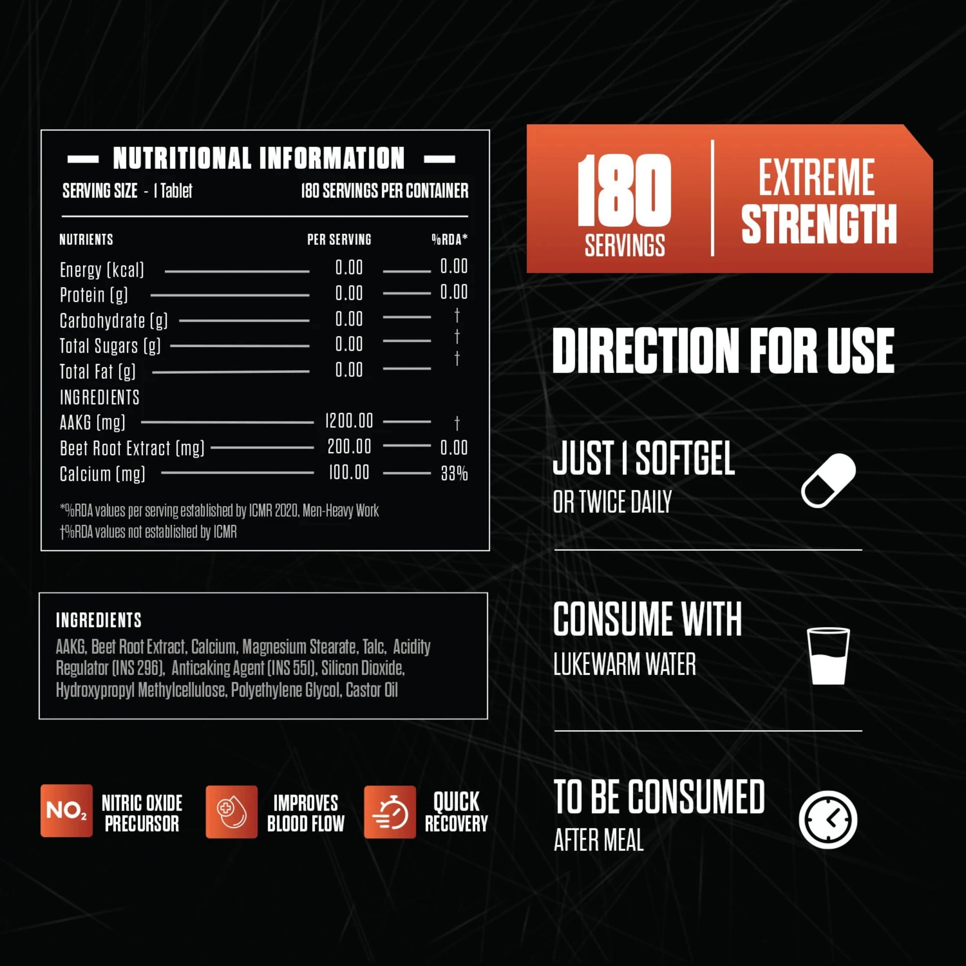 L-Arginine Alpha-Ketoglutarate (AAKG), Beet Root Extract, Calcium, Microcrystalline Cellulose, Magnesium Stearate, Talc, Approved Food Colors, Purified Talc, Polyvinylpyrrolidone, Polyethylene Glycol, Cross-Linked Sodium Carboxy Methyl Cellulose, Acacia, HPMC.